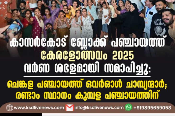 പ്രാദേശികം കാസർകോട് ബ്ലോക്ക് പഞ്ചായത്ത് “കേരളോത്സവം 2025″വർണ ശഭളമായി സമാപിച്ചു. ചെങ്കള പഞ്ചായത്ത് ഒവർഓൾ ചാമ്പ്യന്മാർ, രണ്ടാം സ്ഥാനം കുമ്പള പഞ്ചായത്തിന്October 21, 2025