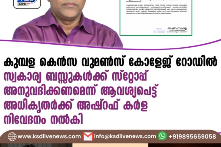 പ്രാദേശികം കുമ്പള കെൻസ വുമൺസ് കോളേജ് റോഡിൽ സ്വകാര്യ ബസ്സുകൾക്ക് സ്റ്റോപ്പ് അനുവദിക്കണമെന്ന് ആവശ്യപെട്ട് അധികൃതർക്ക് അഷ്റഫ് കർള നിവേദനം നൽകിOctober 29, 2025