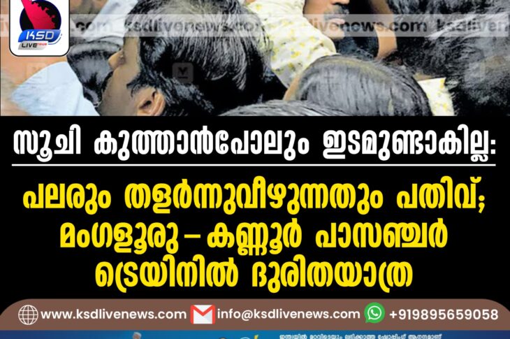 പ്രാദേശികം സൂചി കുത്താൻപോലും ഇടമുണ്ടാകില്ല: പലരും തളർന്നുവീഴുന്നതും പതിവ്; മംഗളൂരു-കണ്ണൂർ പാസഞ്ചർ ട്രെയിനിൽ ദുരിതയാത്രNovember 1, 2025
