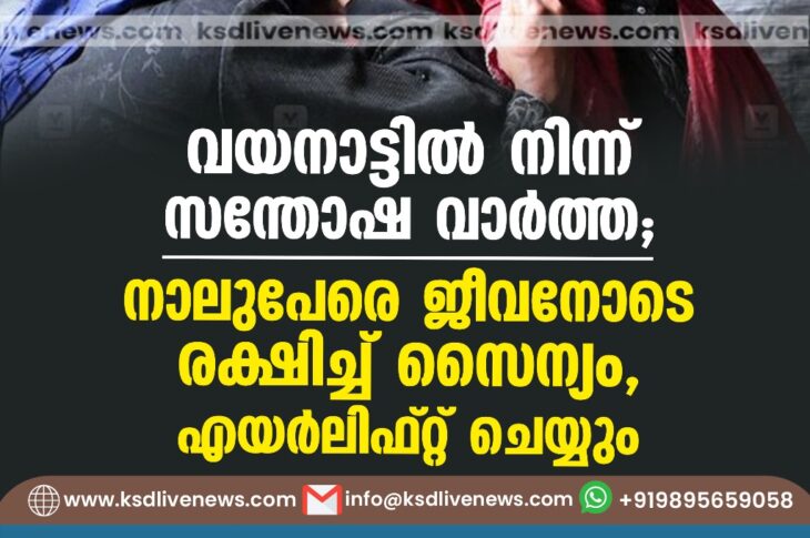 വയനാട് വയനാട്ടിൽനിന്ന് സന്തോഷവാർത്ത; നാലുപേരെ ജീവനോടെ രക്ഷിച്ച് സൈന്യം, എയർലിഫ്റ്റ് ചെയ്യുംAugust 2, 2024