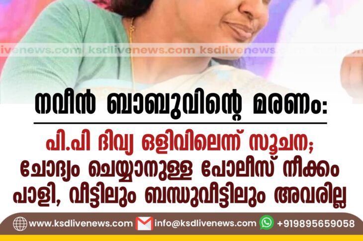 കണ്ണൂർ നവീന് ബാബുവിന്റെ മരണം: പി പി ദിവ്യ ഒളിവിലെന്ന് സൂചന; ചോദ്യം ചെയ്യാനുള്ള പോലീസ് നീക്കം പാളി, വീട്ടിലും ബന്ധുവീട്ടിലും അവരില്ലOctober 19, 2024