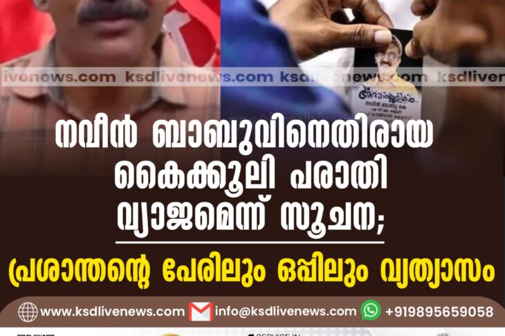 കണ്ണൂർ നവീൻ ബാബുവിനെതിരായ കൈക്കൂലി പരാതി വ്യാജമെന്ന് സൂചന; പ്രശാന്തന്റെ പേരിലും ഒപ്പിലും വ്യത്യാസംOctober 19, 2024