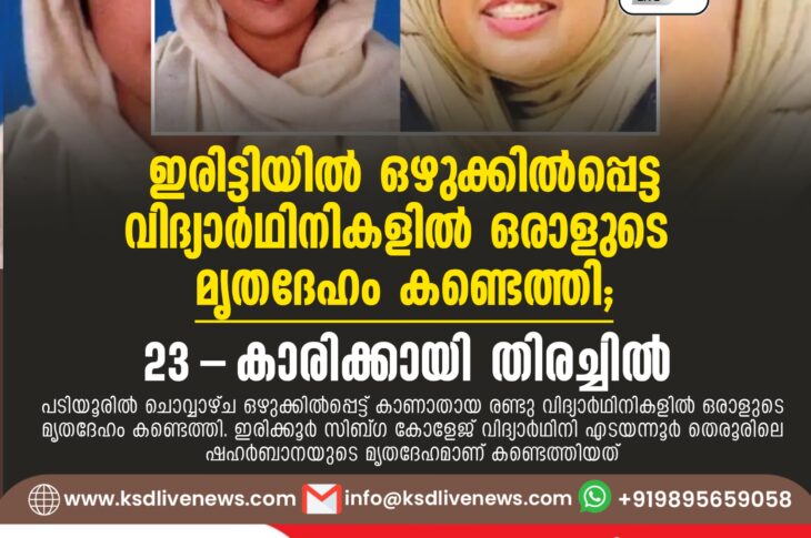 കണ്ണൂർ ഇരിട്ടിയിൽ ഒഴുക്കിൽപ്പെട്ട വിദ്യാർഥിനികളിൽ ഒരാളുടെ മൃതദേഹം കണ്ടെത്തി, 23-കാരിക്കായി തിരച്ചിൽJuly 4, 2024