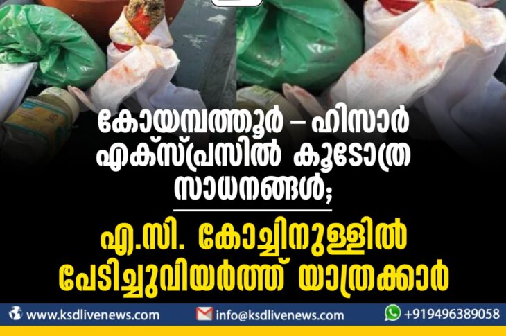കണ്ണൂർ കോയമ്പത്തൂർ-ഹിസാർ എക്സ്പ്രസിൽ ‘കൂടോത്ര’ സാധനങ്ങൾ; എ.സി. കോച്ചിനുള്ളിൽ പേടിച്ചുവിയർത്ത് യാത്രക്കാർApril 16, 2024
