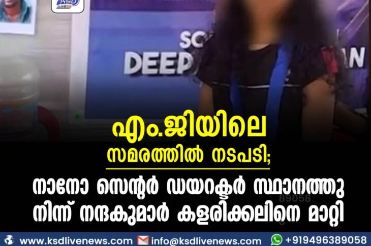 കായികം എം.ജിയിലെ സമരത്തില് നടപടി; നാനോ സെന്റര് ഡയറക്ടര് സ്ഥാനത്തുനിന്ന് നന്ദകുമാര് കളരിക്കലിനെ മാറ്റിNovember 6, 2021