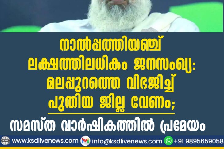 കാസർഗോഡ് നാല്പ്പത്തിയഞ്ച് ലക്ഷത്തിലധികം ജനസംഖ്യ, മലപ്പുറത്തെ വിഭജിച്ച് പുതിയ ജില്ല വേണം: സമസ്ത വാര്ഷികത്തില് പ്രമേയംFebruary 7, 2026