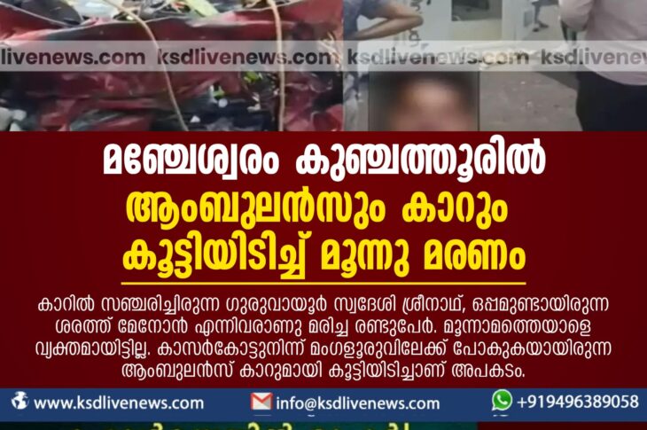 കാസർഗോഡ് മഞ്ചേശ്വരം കുഞ്ചത്തൂരിൽ ആംബുലൻസും കാറും കൂട്ടിയിടിച്ച് 3 മരണം; മരിച്ചവർ അച്ഛനും രണ്ട് മക്കളുംMay 7, 2024