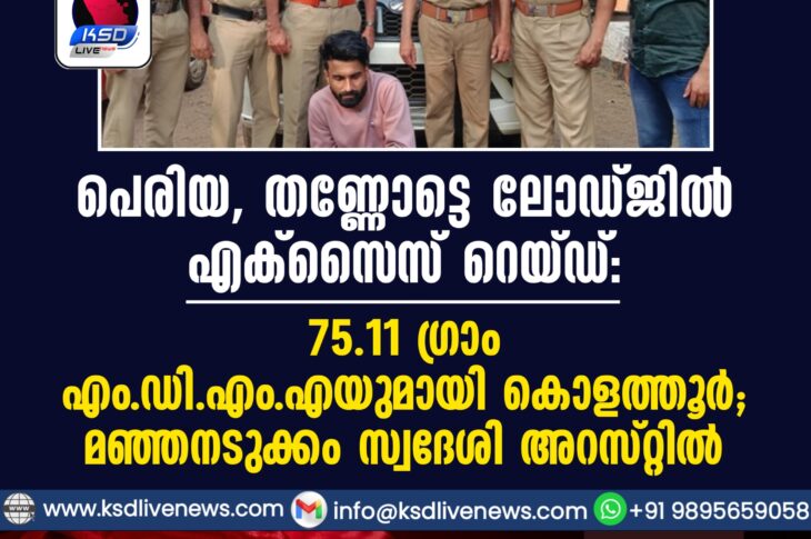 കാസർഗോഡ് പെരിയ, തണ്ണോട്ടെ ലോഡ്ജില് എക്സൈസ് റെയ്ഡ്: 75.11ഗ്രാം എം.ഡി.എം.എയുമായി കൊളത്തൂര്; മഞ്ഞനടുക്കം സ്വദേശി അറസ്റ്റില്February 3, 2026