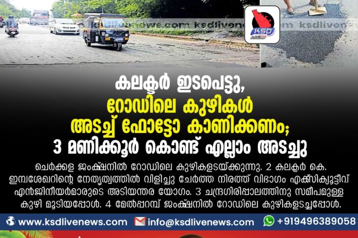 കാസർഗോഡ് കലക്ടർ ഇടപെട്ടു, റോഡിലെ കുഴികൾ അടച്ച് ഫോട്ടോ കാണിക്കണം; 3 മണിക്കൂർ കൊണ്ട് എല്ലാം അടച്ചുSeptember 22, 2023