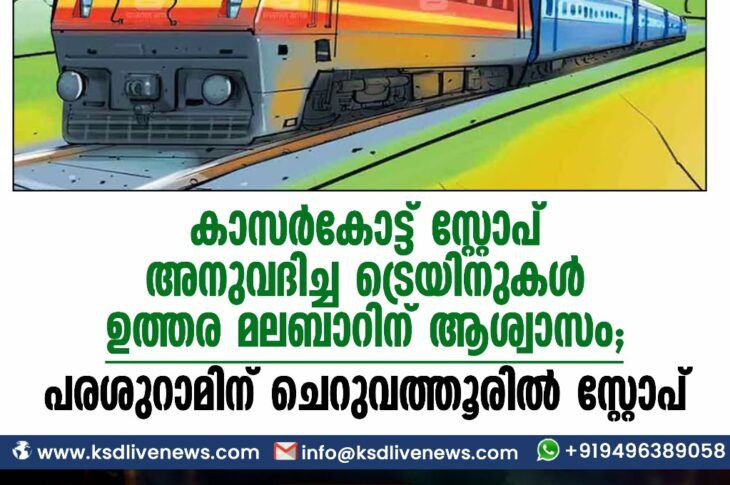 കാസർഗോഡ് കാസർകോട്ട് സ്റ്റോപ് അനുവദിച്ച ട്രെയിനുകൾ ഉത്തര മലബാറിന് ആശ്വാസം; പരശുറാമിന് ചെറുവത്തൂരിൽ സ്റ്റോപ്August 17, 2023