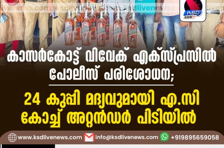 കാസർഗോഡ് കാസര്കോട്ട് വിവേക് എക്സ്പ്രസില് പോലീസ് പരിശോധന: 24 കുപ്പി മദ്യവുമായി എസി കോച്ച് അറ്റന്ഡര് പിടിയിൽNovember 15, 2025