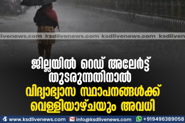 കാസർഗോഡ് ജില്ലയില് റെഡ് അലേര്ട്ട് തുടരുന്നതിനാല് വിദ്യാഭ്യാസ സ്ഥാപനങ്ങള്ക്ക് വെള്ളിയാഴ്ചയും അവധിJuly 6, 2023