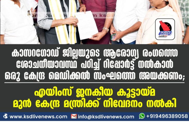 കാസർഗോഡ് കാസറഗോഡ് ജില്ലയുടെ ആരോഗ്യ രംഗത്തെ ശോചനീയാവസ്ഥ പഠിച്ച് റിപ്പോർട്ട് നൽകാൻ ഒരു കേന്ദ്ര മെഡിക്കൽ സംഘത്തെ അയക്കണം: എയിംസ് ജനകീയ കൂട്ടായ്മ മുൻ കേന്ദ്ര മന്ത്രിക്ക് നിവേദനം നൽകിJune 21, 2023