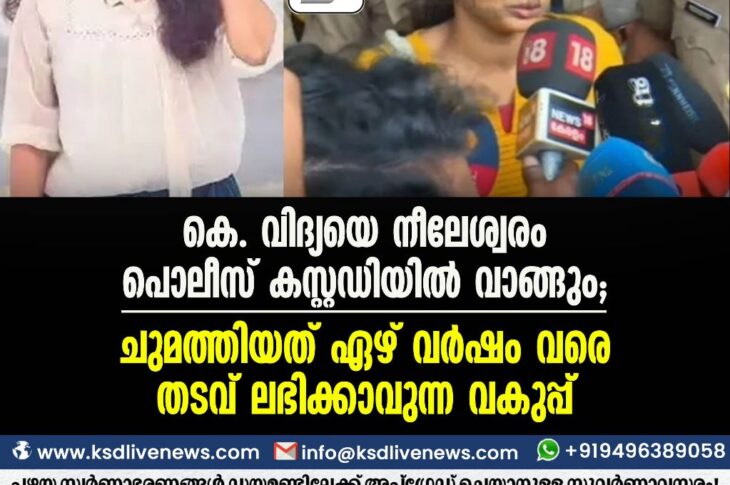 കാസർഗോഡ് കെ. വിദ്യയെ നീലേശ്വരം പൊലീസ് കസ്റ്റഡിയില് വാങ്ങും; ചുമത്തിയത് ഏഴ് വര്ഷം വരെ തടവ് ലഭിക്കാവുന്ന വകുപ്പ്June 22, 2023
