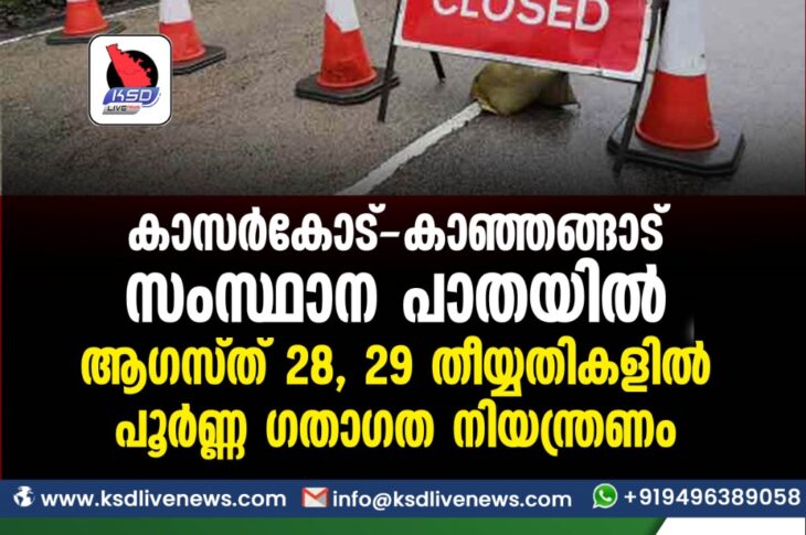 കാസർഗോഡ് കാസര്കോട്-കാഞ്ഞങ്ങാട് സംസ്ഥാന പാതയില് ആഗസ്ത് 28, 29 തീയ്യതികളില് പൂര്ണ്ണ ഗതാഗത നിയന്ത്രണംAugust 24, 2022