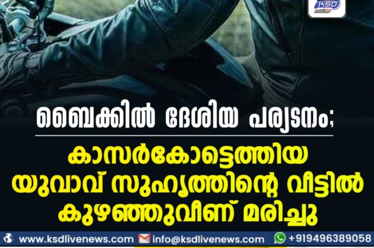 കാസർഗോഡ് ബൈക്കില് ദേശിയ പര്യടനം; കാസർകോട്ടെത്തിയ യുവാവ് സുഹൃത്തിന്റെ വീട്ടിൽ കുഴഞ്ഞുവീണ് മരിച്ചുJuly 7, 2022
