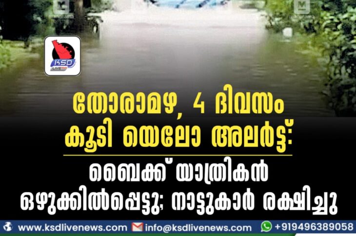 കാസർഗോഡ് തോരാമഴ, 4 ദിവസം കൂടി യെലോ അലർട്ട്: ബൈക്ക് യാത്രികൻ ഒഴുക്കിൽപ്പെട്ടു; നാട്ടുകാർ രക്ഷിച്ചുJuly 8, 2022