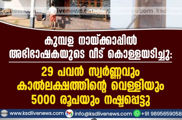 കാസർഗോഡ് കുമ്പള നായ്ക്കാപ്പില് അഭിഭാഷകയുടെ വീട് കൊള്ളയടിച്ചു: 29 പവന് സ്വര്ണ്ണവും കാല്ലക്ഷത്തിന്റെ വെള്ളിയും 5000 രൂപയും നഷ്ടപ്പെട്ടുJanuary 19, 2026
