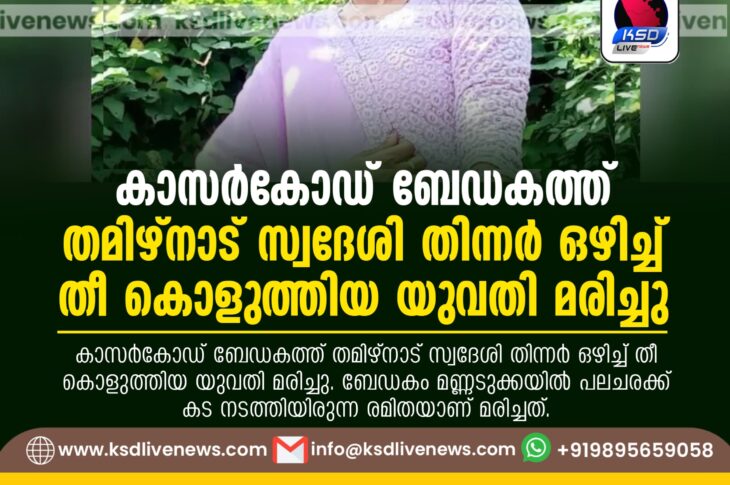 കാസർഗോഡ് കാസര്കോഡ് ബേഡകത്ത് തമിഴ്നാട് സ്വദേശി തിന്നര് ഒഴിച്ച് തീ കൊളുത്തിയ യുവതി മരിച്ചുApril 15, 2025
