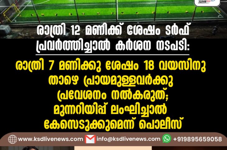 രാത്രി 12 മണിക്ക് ശേഷം ടര്‍ഫ് പ്രവര്‍ത്തിച്ചാല്‍ കര്‍ശന നടപടി; രാത്രി 7 മണിക്കു ശേഷം 18 വയസിനു താഴെ പ്രായമുള്ളവര്‍ക്കു പ്രവേശനം നല്‍കരുത്, മുന്നറിയിപ്പ് ലംഘിച്ചാല്‍ കേസെടുക്കുമെന്ന് പൊലീസ്