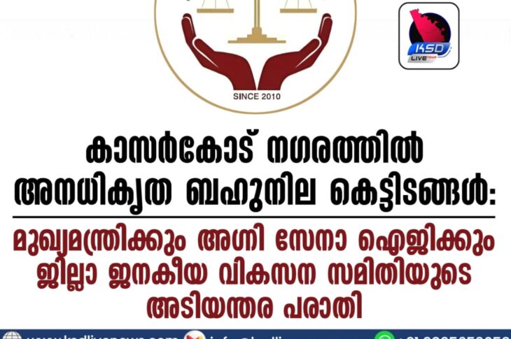 കാസർഗോഡ് കാസർകോട് നഗരത്തിൽ അനധികൃത ബഹുനില കെട്ടിടങ്ങൾ: മുഖ്യമന്ത്രിക്കും അഗ്നി സേനാ ഐജിക്കും ജില്ലാ ജനകീയ വികസന സമിതിയുടെ അടിയന്തര പരാതിFebruary 16, 2026