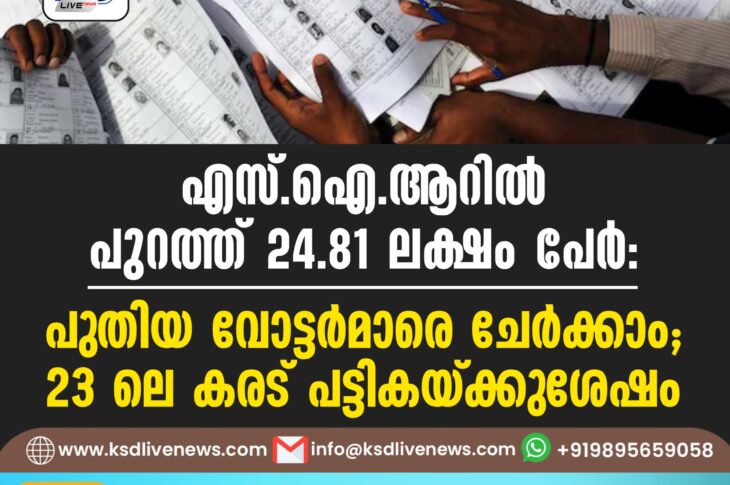 കേരളം എസ്ഐആറിൽ പുറത്ത് 24.81 ലക്ഷം പേർ: പുതിയ വോട്ടർമാരെ ചേർക്കാം, 23 ലെ കരട് പട്ടികയ്ക്കുശേഷംDecember 19, 2025