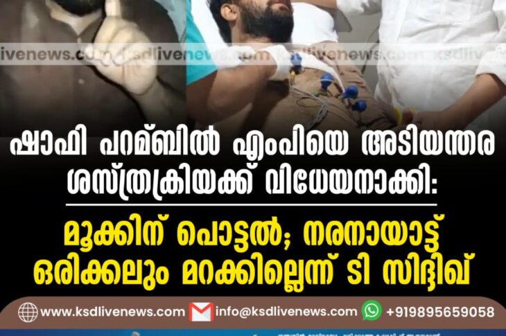 കേരളം ഷാഫി പറമ്ബില് എംപിയെ അടിയന്തര ശസ്ത്രക്രിയക്ക് വിധേയനാക്കി: മൂക്കിന് പൊട്ടല്; നരനായാട്ട് ഒരിക്കലും മറക്കില്ലെന്ന് ടി സിദ്ദിഖ്October 11, 2025