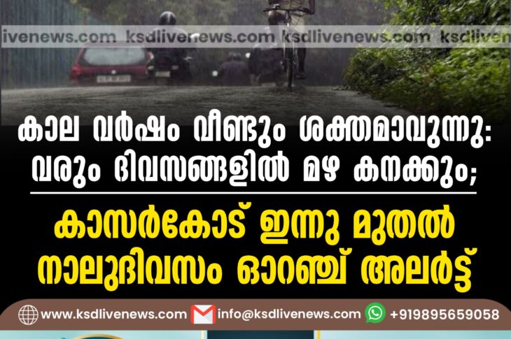 കേരളം കാല വർഷം വീണ്ടും ശക്തമാവുന്നു: വരും ദിവസങ്ങളിൽ മഴ കനക്കും; കാസര്കോട് ഇന്നു മുതല് നാലുദിവസം ഓറഞ്ച് അലര്ട്ട്August 16, 2025