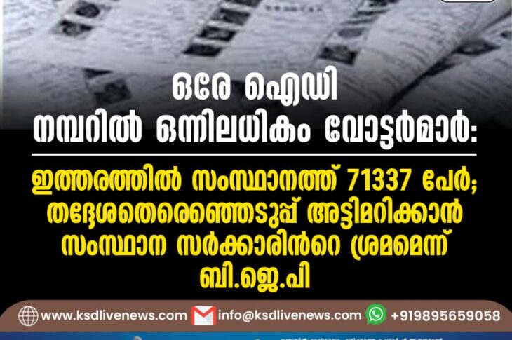 കേരളം ഒരേ ഐഡി നമ്പറില് ഒന്നിലധികം വോട്ടര്മാര്: ഇത്തരത്തില് സംസ്ഥാനത്ത് 71337 പേര്; തദ്ദേശതെരെഞ്ഞെടുപ്പ് അട്ടിമറിക്കാൻ സംസ്ഥാന സര്ക്കാരിന്റെ ശ്രമമെന്ന് ബി.ജെ.പിAugust 7, 2025