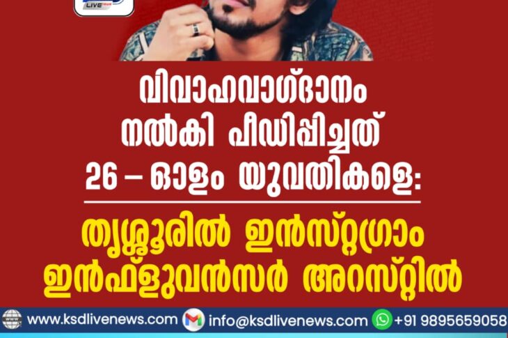 കേരളം വിവാഹവാഗ്ദാനം നൽകി പീഡിപ്പിച്ചത് 26-ഓളം യുവതികളെ; തൃശ്ശൂരിൽ ഇൻസ്റ്റഗ്രാം ഇൻഫ്ളുവൻസർ അറസ്റ്റിൽFebruary 20, 2026