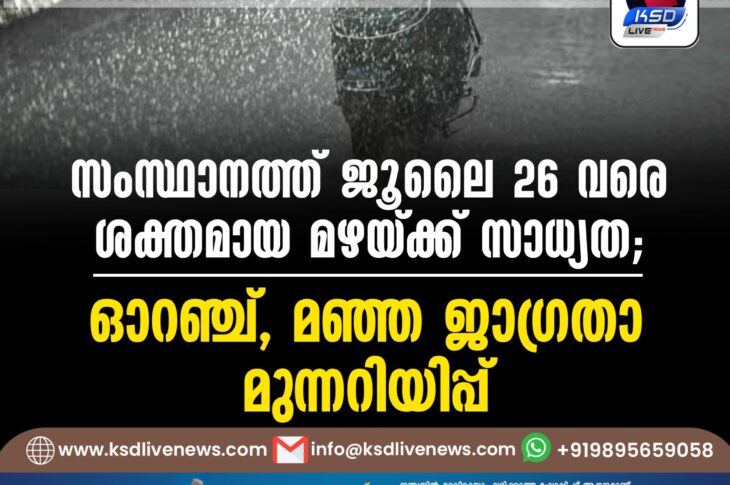 കേരളം സംസ്ഥാനത്ത് ജൂലൈ 26 വരെ ശക്തമായ മഴയ്ക്ക് സാധ്യത; ഓറഞ്ച്, മഞ്ഞ ജാഗ്രതാ മുന്നറിയിപ്പ്July 23, 2025