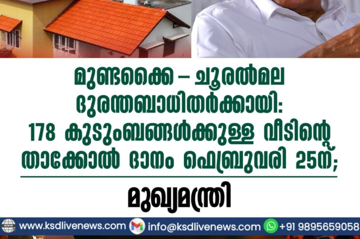 കേരളം മുണ്ടക്കൈ-ചൂരൽമല ദുരന്തബാധിതർക്കായി: 178 കുടുംബങ്ങൾക്കുള്ള വീടിന്റെ താക്കോൽ ദാനം ഫെബ്രുവരി 25ന്; മുഖ്യമന്ത്രിFebruary 19, 2026