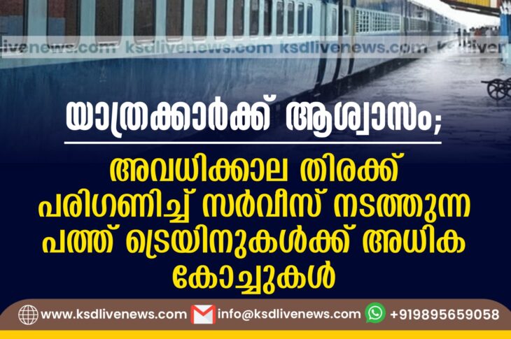 കേരളം യാത്രക്കാര്ക്ക് ആശ്വാസം; അവധിക്കാല തിരക്ക് പരിഗണിച്ച് സര്വീസ് നടത്തുന്ന പത്ത് ട്രെയിനുകള്ക്ക് അധിക കോച്ചുകള്April 18, 2025