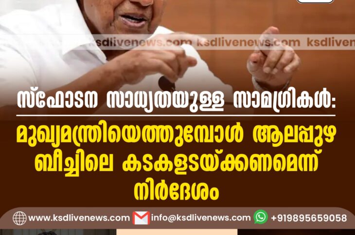 കേരളം സ്ഫോടന സാധ്യതയുള്ള സാമഗ്രികൾ: മുഖ്യമന്ത്രിയെത്തുമ്പോൾ ആലപ്പുഴ ബീച്ചിലെ കടകളടയ്ക്കണമെന്ന് നിർദേശംApril 11, 2025