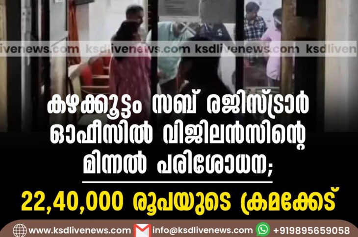 കേരളം കഴക്കൂട്ടം സബ് രജിസ്ട്രാർ ഓഫീസിൽ വിജിലൻസിന്റെ മിന്നൽ പരിശോധന; 22,40,000 രൂപയുടെ ക്രമക്കേട് April 7, 2025