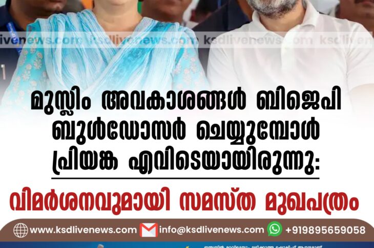 കേരളം മുസ്ലിം അവകാശങ്ങൾ ബിജെപി ബുൾഡോസർ ചെയ്യുമ്പോൾ പ്രിയങ്ക എവിടെയായിരുന്നു: വിമർശനവുമായി സമസ്ത മുഖപത്രംApril 4, 2025