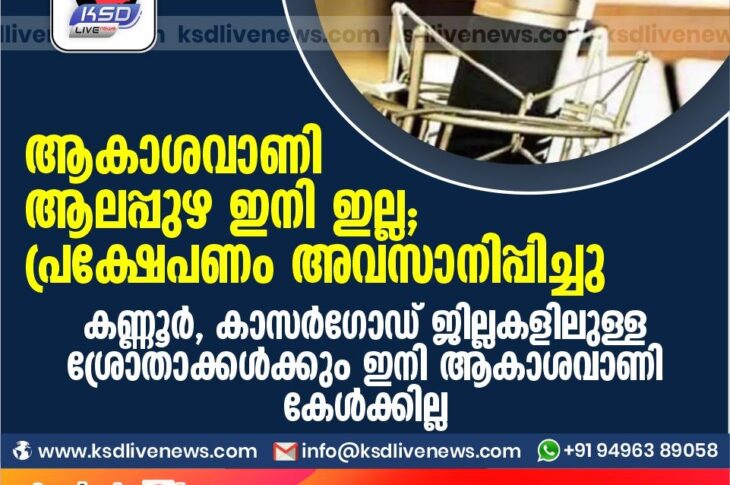കേരളം ആകാശവാണി ആലപ്പുഴ ഇനി ഇല്ല ; പ്രക്ഷേപണം അവസാനിപ്പിച്ചുകണ്ണൂർ, കാസർഗോഡ് ജില്ലകളിലുള്ള ശ്രോതാക്കൾക്കും ഇനി ആകാശവാണി കേൾക്കില്ലNovember 7, 2020