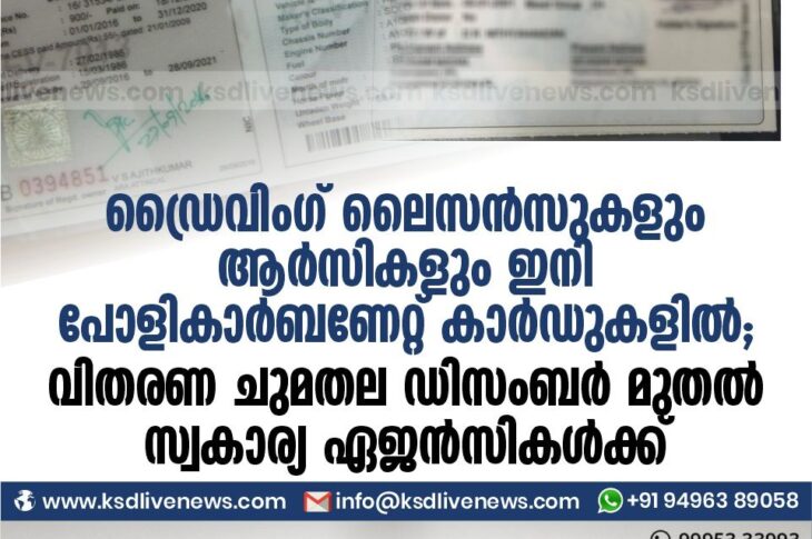കേരളം ഡ്രൈവിംഗ് ലൈസൻസുകളും ആർസികളും ഇനി പോളികാർബണേറ്റ് കാർഡുകളിൽ ; വിതരണ ചുമതല ഡിസംബർ മുതൽ സ്വകാര്യ ഏജൻസികൾക്ക്November 1, 2020