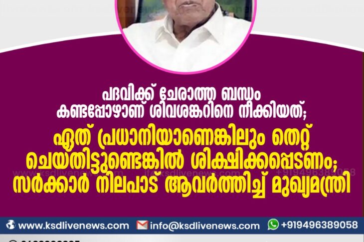 കേരളം പദവിക്ക് ചേരാത്ത ബന്ധം കണ്ടപ്പോഴാണ് ശിവശങ്കറിനെ നീക്കിയത് ; ഏത് പ്രധാനിയാണെങ്കിലും തെറ്റ് ചെയ്തിട്ടുണ്ടെങ്കിൽ ശിക്ഷിക്കപ്പെടണം ; സർക്കാർ നിലപാട് ആവർത്തിച്ച് മുഖ്യമന്ത്രിOctober 19, 2020