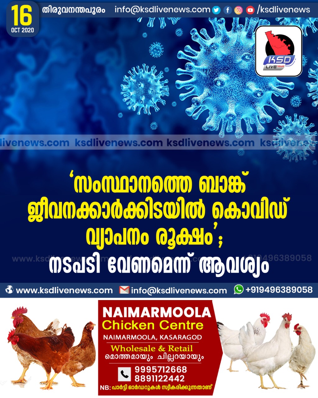 കേരളം ‘ സംസ്ഥാനത്തെ ബാങ്ക് ജീവനക്കാർക്കിടയിൽ കൊവിഡ് വ്യാപനം രൂക്ഷം ‘ ; നടപടി വേണമെന്ന് ആവശ്യംOctober 16, 2020