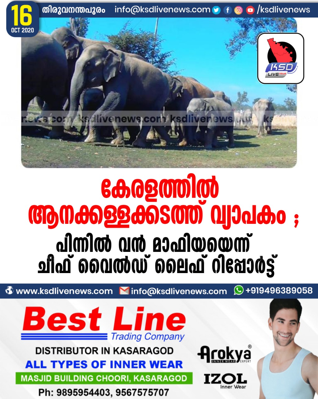 കേരളം കേരളത്തിൽ ആനക്കള്ളക്കടത്ത് വ്യാപകം ; പിന്നിൽ വൻ മാഫിയയെന്ന് ചീഫ് വൈൽഡ് ലൈഫ് റിപ്പോർട്ട്October 16, 2020