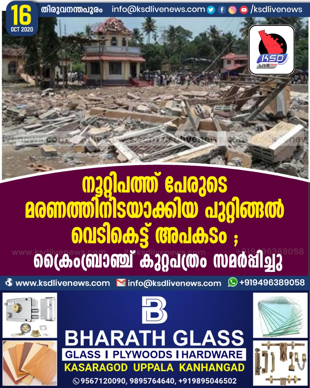 കേരളം നൂറ്റിപത്ത് പേരുടെ മരണത്തിനിടയാക്കിയ പുറ്റിങ്ങൽ വെടികെട്ട് അപകടം ; ക്രൈംബ്രാഞ്ച് കുറ്റപത്രം സമർപ്പിച്ചുOctober 16, 2020