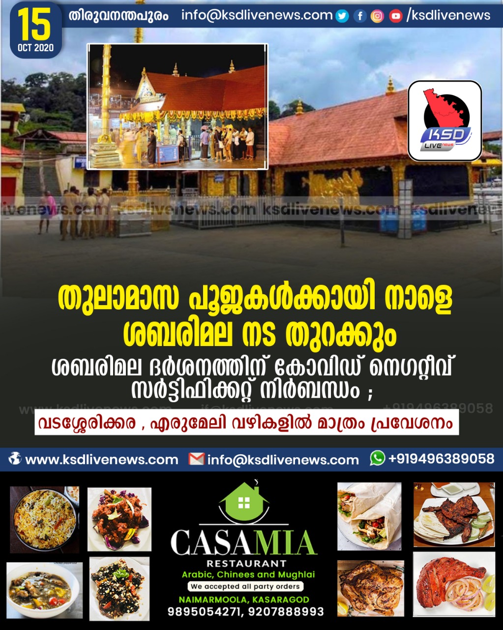 കേരളം തുലാമാസ പൂജകള്ക്കായി നാളെ ശബരിമല നട തുറക്കുംശബരിമല ദർശനത്തിന് കോവിഡ് നെഗറ്റീവ് സർട്ടിഫിക്കറ്റ് നിർബന്ധം ; വടശ്ശേരിക്കര , എരുമേലി വഴികളിൽ മാത്രം പ്രവേശനംOctober 15, 2020