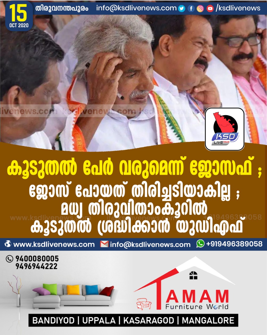 കേരളം കൂടുതൽ പേർ വരുമെന്ന് ജോസഫ് ; ജോസ് പോയത് തിരിച്ചടിയാകില്ല ; മധ്യ തിരുവിതാംകൂറിൽ കൂടുതൽ ശ്രദ്ധിക്കാൻ യുഡിഎഫ്October 15, 2020