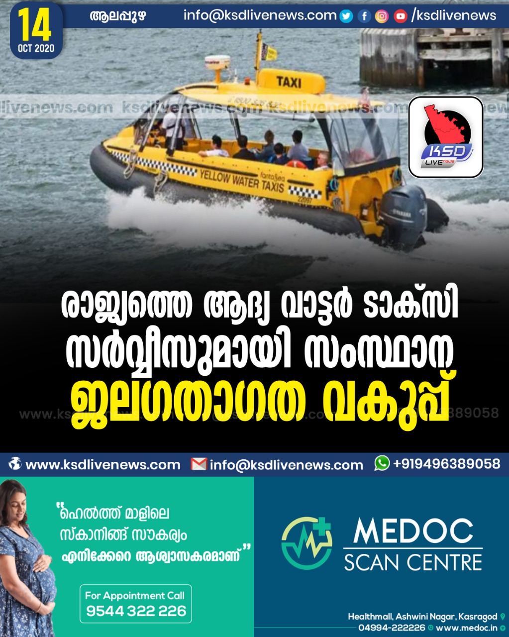രാജ്യത്തെ ആദ്യ വാട്ടർ ടാക്സി സർവ്വീസുമായി സംസ്ഥാന ജലഗതാഗത വകുപ്പ് TAXI