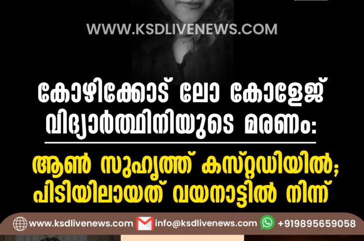 കേരളം കോഴിക്കോട് ലോ കോളേജ് വിദ്യാര്ത്ഥിനിയുടെ മരണം; ആണ് സുഹൃത്ത് കസ്റ്റഡിയില്, പിടിയിലായത് വയനാട്ടില് നിന്ന്March 6, 2025