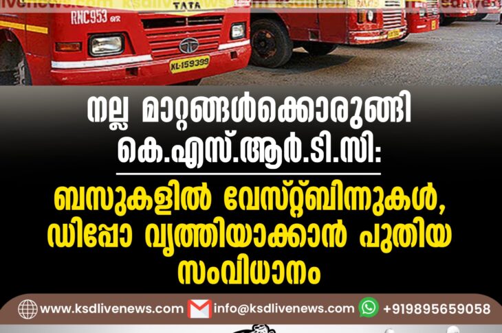 കേരളം നല്ല മാറ്റങ്ങള്ക്കൊരുങ്ങി KSRTC; ബസുകളില് വേസ്റ്റ്ബിന്നുകള്,ഡിപ്പോ വൃത്തിയാക്കാന് പുതിയ സംവിധാനംFebruary 28, 2025