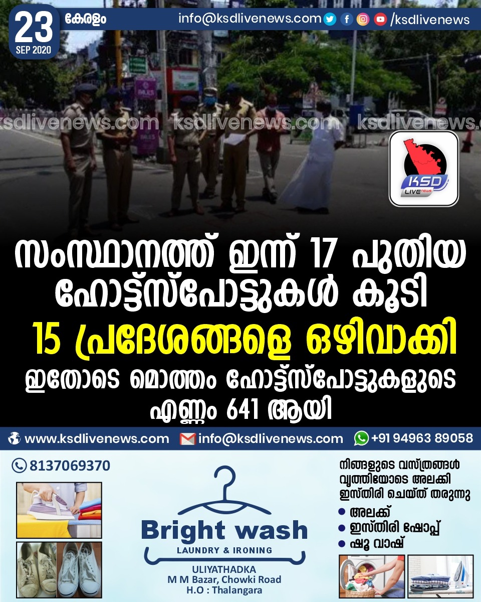 കേരളം സംസ്ഥാനത്ത് ഇന്ന് 17 പുതിയ ഹോട്ട്സ്പോട്ടുകള് കൂടി; 15 പ്രദേശങ്ങളെ ഒഴിവാക്കി.ഇതോടെ മൊത്തം ഹോട്ട്സ്പോട്ടുകളുടെ എണ്ണം 641 ആയി.September 23, 2020