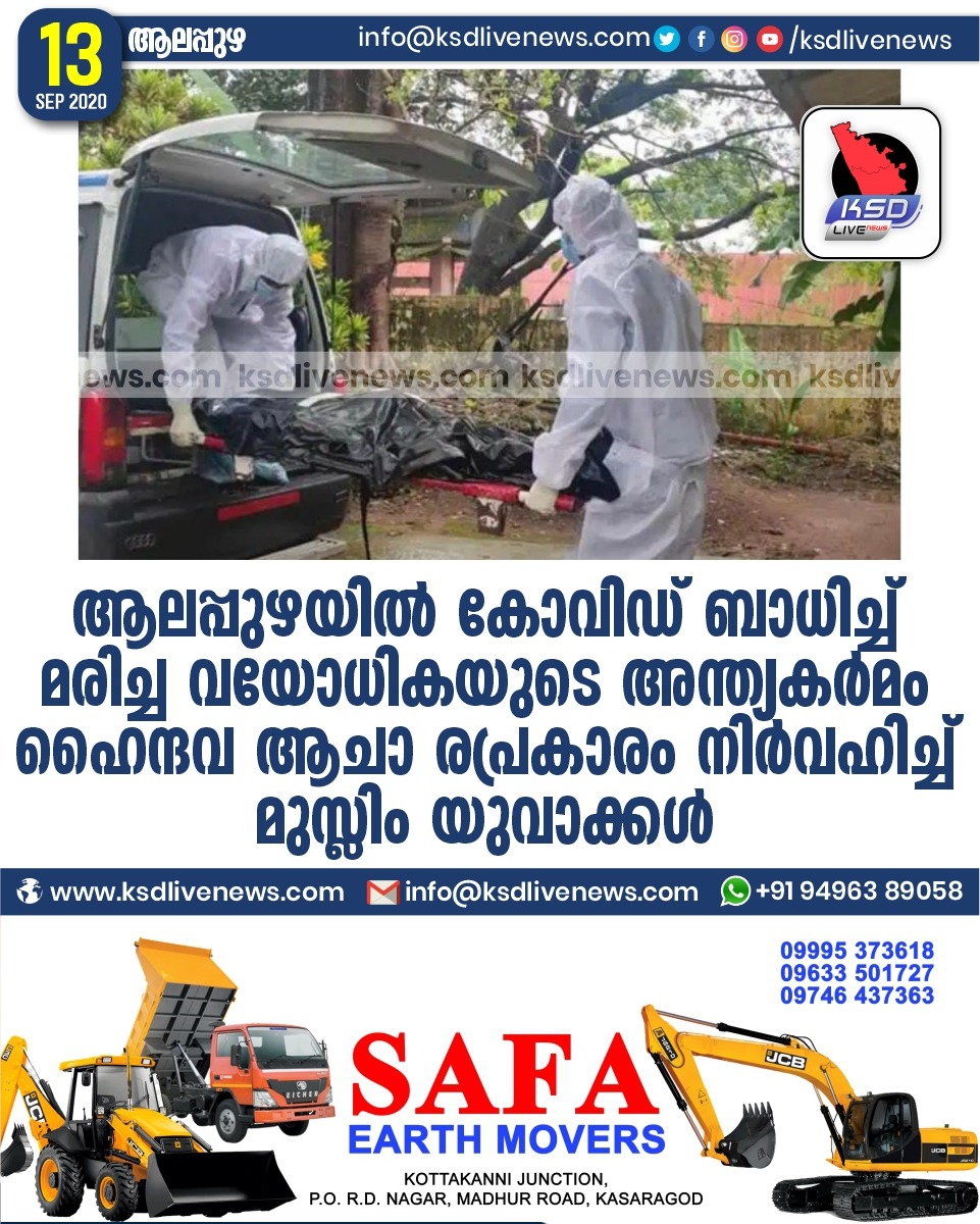 കേരളം ആലപ്പുഴയിൽ കോവിഡ് ബാധിച്ച് മരിച്ച വയോധികയുടെ അന്ത്യകർമം ഹൈന്ദവ ആചാ രപ്രകാരം നിർവഹിച്ച് മുസ്ലിം യുവാക്കൾSeptember 13, 2020