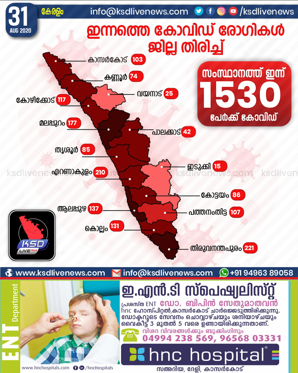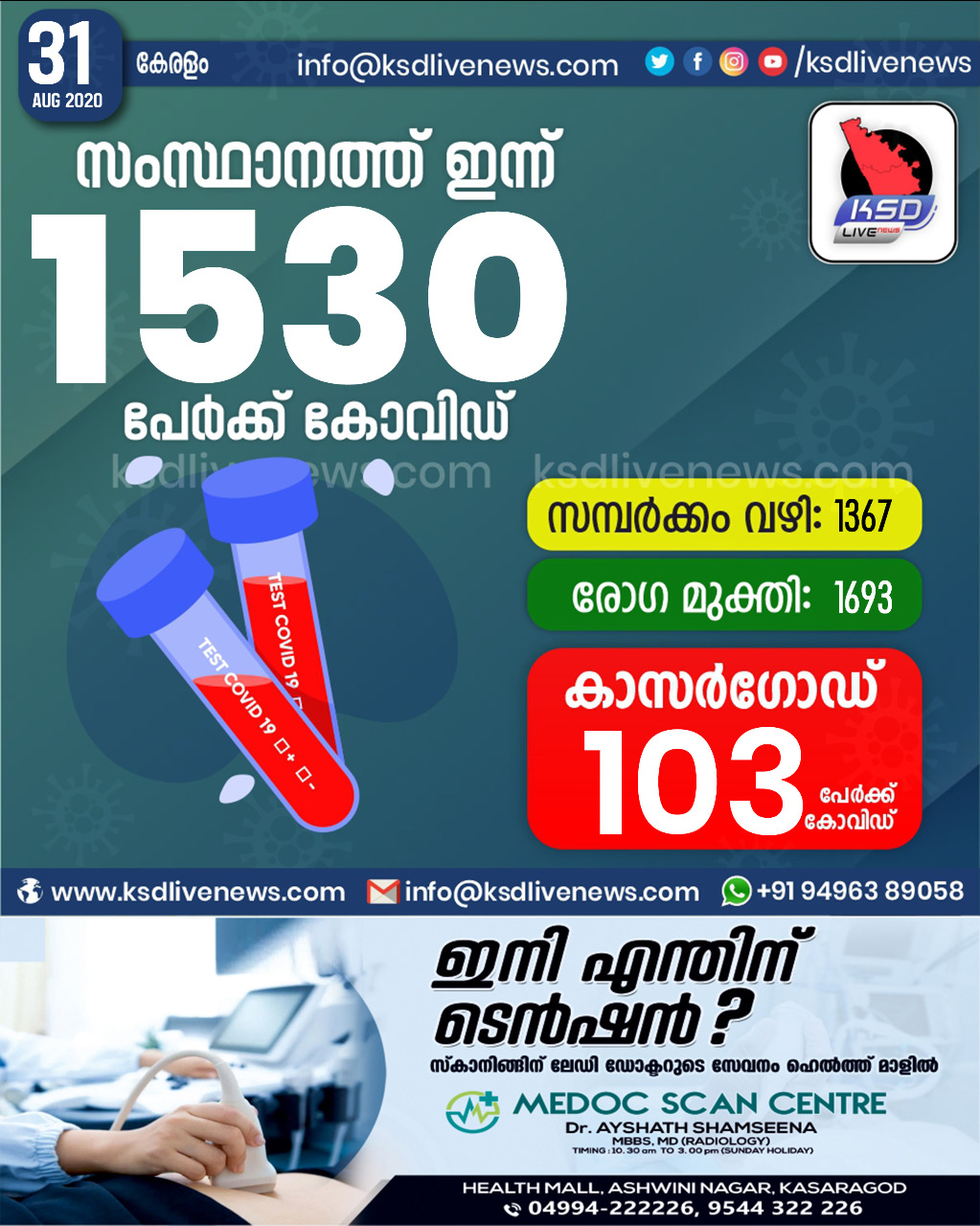 കേരളം സംസ്ഥാനത്ത് ഇന്ന് 1530 പേർക്ക് കോവിഡ് സ്ഥിരീകരിച്ചു. സമ്പർക്കം വഴി 21367 പേർക്കും.രോഗ മുക്തി 1693 പേർക്കും. കാസർഗോഡ് ജില്ലയിൽ ഇന്ന് 103 പേർക്ക് കോവിഡ് സ്ഥിരീകരിച്ചു.August 31, 2020